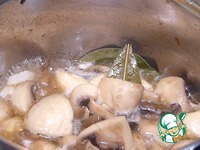 Постоянно помешивая ждем пока шампиньоны начнут выделять сок. Когда маринад закипит варим грибочки, периодически помешивая, 5 минут. |
