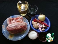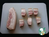 В кипящую воду кладем грудинку и отвариваем минут 5-7. Даём остыть. Нарезаем кубиком примерно 3х3х3 см. (на один укус) (В некоторых рецептах мясо сразу режут на порционные куски, не отваривая.) |