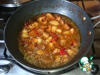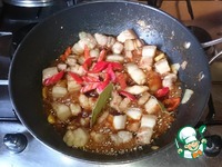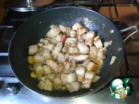 Добавляем грудинку, сахар, (посыпаем всё мясо, помешивая), бадьян, корицу и обжариваем мясо до золотистой корочки, постоянно помешивая, минут 20. (Зависит от плиты и сковороды.) |