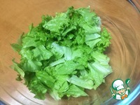 Салат промыть, обсушить бумажным полотенцем, порвать и выложить в миску. |