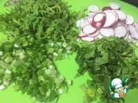 Рукколу промыть, обсушить, порвать руками. Лук измельчить, промытый шпинат порубить. Редис нарезать кружками или половинками кружков, если он крупный. |