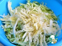 Капусту нашинковать тонко длинными полосками. Выложить в миску, посолить, слегка перетереть, вороша. |