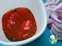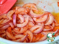 Масло разогреть, выложить в кипящее масло паприку. Также добавить перья красного лука и сразу убрать с огня. Залить овощи и перемешать. |