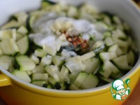 В кастрюльке смешать цуккини, мелко нарезанный чеснок и перец чили, соль, сахар и белый молотый перец. Перемешать. |