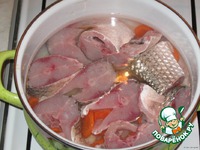 Рыбу почистить, нарезать на порционные куски. Лук порезать кольцами и морковь порезать тонкими кружками, выложить на дно широкой кастрюли. Сверху ровным слоем разложить куски рыбы каждый отдельно. Добавить литра полтора воды, только чтоб слегка покрывала рыбу. Варить на маленьком огне минут 40 -50. В конце варки добавить приправу для рыбы и соль. НИКАКОГО ЖЕЛАТИНА! Выключить по готовности. Аккуратно переложить на блюдо рыбу и залить процеженным бульоном. Он будет прозрачным, если вы варите на маленьком огне. ВСЕ. Поставить на холод . Застывает намертво. Очень вкусно.