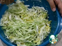 Нашинковать капусту тонкими и длинными полосками. Сложить все в миску. |