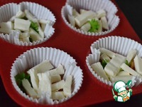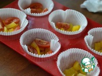 Мелко нарезать болгарский перец, помидоры черри разрезать пополам. Выложить немного перца и помидоров черри на дно формочек. Посолить и поперчить. |