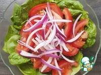 Помидор нарезать произвольно, лук тонкими перьями. |