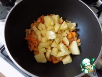 Через минуты 3-5 отправляем в кастрюлю картофель, порезанный небольшим кубиком. Чуть притомим, а это ещё минуты 3-5. |