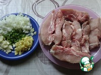 Готово. На гарнир прекрасно подходит отварной рис (Как готовить не скажу. Это бооооольшой секрет.) Зелёный лук, помидор. Рис полить получившимся соусом. (чуть не сказал - подливкой.) |