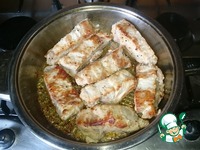 Разогреваем на сковороде растительное и кунжутное масло и обжариваем куски до румяной корочки. Начинаем с мясистой части. Солим, перчим. |