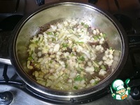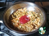 Добавляем томатную пасту. Всё хорошо перемешиваем. Тушим минуты 2. |