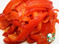 Запечь перец при темп.200 град около 45 минут. Снять кожицу, очистить от семян и нарезать на полоски. |