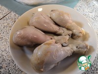 Достать тесто из морозилки и оставить размораживаться. Куриные голени промыть и отварить в подсоленой воде течение 20 минут (почти до готовности). Немного остудить и снять кожу. |