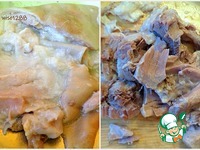 Дать рульке немного остыть. Отделить шкуру. Можно со шкуры удалить сало, оно легко отделяется. Я этого не делала. Мясо освободить от костей и крупно порезать. |