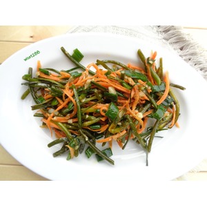 Описание: Насыщенные ярким ароматом чесночные стрелы будут в салате остренькой «изюминкой» и вкусно переплетутся со всеми ингредиентами, а в итоге получится необычное пикантное блюдо.