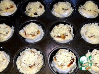 Ячейки формы смазала маслом и положила в них булочки. Верх посыпала измельчённым сыром. |