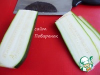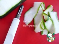 Цуккини нарезать слайсами (4 шт.) с помощью овощечистки (по желанию - для верха). |