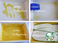 Форму для запекания (18х12х3,5 см) смазать оливковым масло, присыпать кукурузной крупой, излишки стряхнуть. На дно выложить часть цуккини. ЦУККИНИ НЕ СОЛИТЬ!!! (при запекании выделят много жидкости) |