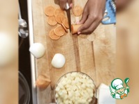 После того, как бульон готов, достаем курицу, режем ее на кусочки и забрасываем обратно. Туда же картофель, а через 5 минут морковь и лук |