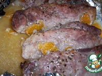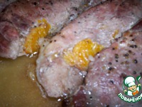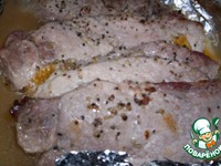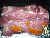- посолить, поперчить свинину, выложить на фольгу мандарины + свинина, |