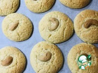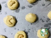 Влажными руками из теста сформировать шарики с грецкий орех, выложить на противень на расстоянии 5 см. Друг от друга, сверху положить орешек кешью, немного придавить. |