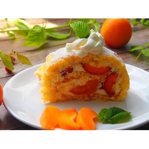 Нанести начинку, разложить половинки абрикосов и с помощью полотенца свернуть рулет. В конце "пути"поставить блюдо, на котором будет находится рулет, и просто закатить на него рулет. |