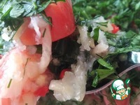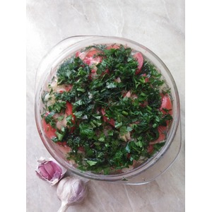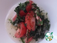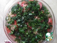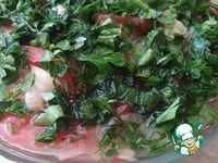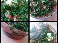 И снова помидоры+смесь перцев+зелень+маринад. Так до конца, у меня получилось в 3 слоя, разделила изначально на 3 части. Теперь нашу закуску закрываем крышкой и убираем в холодильник на 8 часов. |