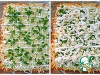 Зеленый лук нарезать колечками и разложить по картофелю, завершить слоем из яиц и сеточкой из майонеза. |