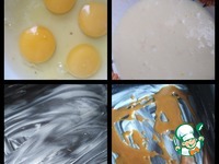 Яйца взбить с молоком. Смазать форму сливочным маслом и хаотичными движениями налить ложкой карамель. |
