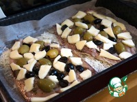 Уложить разрезанные пополам маслины и оливки, разломанный на кусочки сыр сулугуни. |
