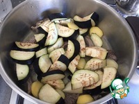 Добавляем картофель. Продолжаем тушить минуть 10. Далее добавляем баклажаны. Тушим все минут 20, не забывая перемешивать. |