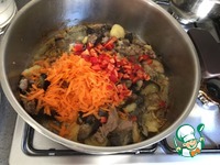 Добавляем морковь, болгарский перец, специи по вкусу. Тушим до готовности всех ингредиентов. |