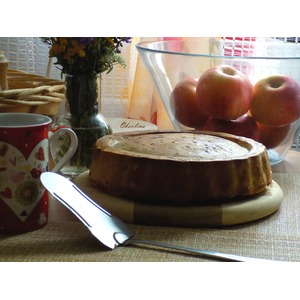 Хорошо бы пирогу остыть. По желанию его можно остывшим присыпать корицей, но у меня не очень любят. Я не стала ждать, когда пирог остынет и отрезала себе кусочек. Вот такой разрез. |