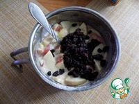 Описание: Заливной пирог на кислом молоке с яблоками, тёмным изюмом и ванилью, тесто которого я сделала с добавлением Геркулеса в пшеничную муку. Это именно-пирог, а не шарлотка. От того что я взяла много яблок, внутри пирог немного влажный. В меру сладкий, с ароматом ванили, яблок и изюма. Остывший вкусней для меня, хотя и от тёплого я тоже не удержалась и съела кусочек.