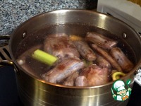 Сложить в кастрюлю, залить холодной водой так, чтобы вода немного покрывала мясо. |