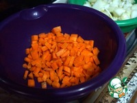 Пока мясо варится, нарезать вторую половину моркови кубиком. |