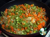 Добавить морковь и перец, перемешать, жарить 3 минуты. Затем добавить поварешку бульона, немного посолить, накрыть крышкой, убавить огонь и тушить зажарку до мягкости моркови. |
