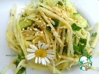 Описание: Салат лёгкий, пикантный и хрустящий с ярким набором вкусов и ароматов. Нежный вкус кольраби и аромат огурцов прекрасно гармонируют с куркумой, перцем и чесноком.