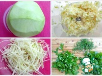 Кольраби почистить, нарезать соломкой. Замечено, что при нарезании соломкой из кольраби почти не выделается сок. Чеснок измельчить. Зелень (петрушку, укроп, зеленый лук) мелко порезать. |