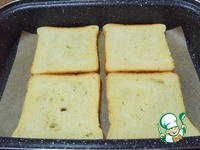 На противень, застеленный бумагой для выпечки, выкладываю ломтики хлеба. Ставлю хлеб подсушиться в заранее разогретую до 200°C духовку на 3-5 минут. |