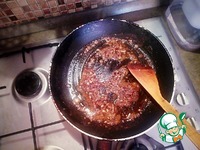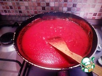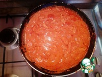 Заливаем томатной пастой, кладём лавровый лист, орехи кешью и сахар. Накрываем соус крышкой и тушим в течении 15 минут. |