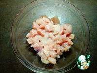 Куриное филе моем, нарезаем на мелкие кусочки и помещаем в большую миску. |