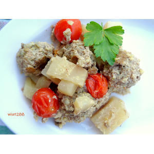 Описание: Сочная, нежная кольраби замечательно сочетается с кабачково – грибной заливкой, вкус повышают тефтели, а помидоры черри служат не только украшением, они дополняют своим неповторимым видом и ароматом.