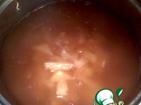 Пока у нас все проваривается, делаем зажарку из лука, моркови и огурца. Все это добавляем в бульон + немножко специй. |