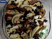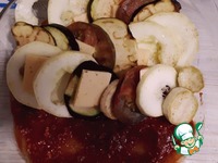 Выкладываем наши кольца баклажана, кабачка, помидоры в любой очередности, последовательности, как вашей фантазии угодно. Вкладываем сыр между овощами. |