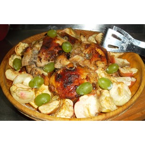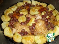 Сверху курятину, сверху опять яблоки и виноград, опять курятина. |
