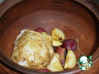 Куриные бедра маринуем в приправе и горчице около 2…3-х часов. Пока маринуются – нарежем яблоки и надергаем виноград… |