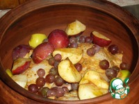 В удобную посудину высыпаем слой яблок с виноградом ( тут, конечно, не плохо было бы иметь кеци, но у меня она лопнула, к сожалению...), поэтому обошелся обычной глиняной макитрой... |