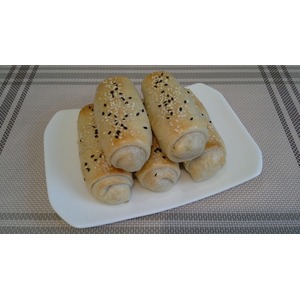 Выкладываем пирожки на противень. Смазываем взбитым яйцом и посыпаем кунжутом.